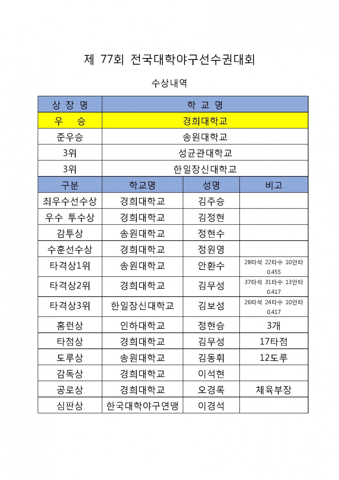 인쇄 목록 제목 2022 전국대학야구 선수권대회 수상내역 작성자 한국대학야구연맹 2,960 0 작성일 2023-04-11 14:23:48 본문 2022 전국대학야구 선수권대회우승: 경희대학교 인쇄 목록 이전글 ▲제56회 대통령기 성적 게제문 (2022년) 다음글 ▼제77회 전국대학야구선수권대회 결승전 결과 댓글목록 등록된 댓글이 없습니다. 이전글 다음글 목록